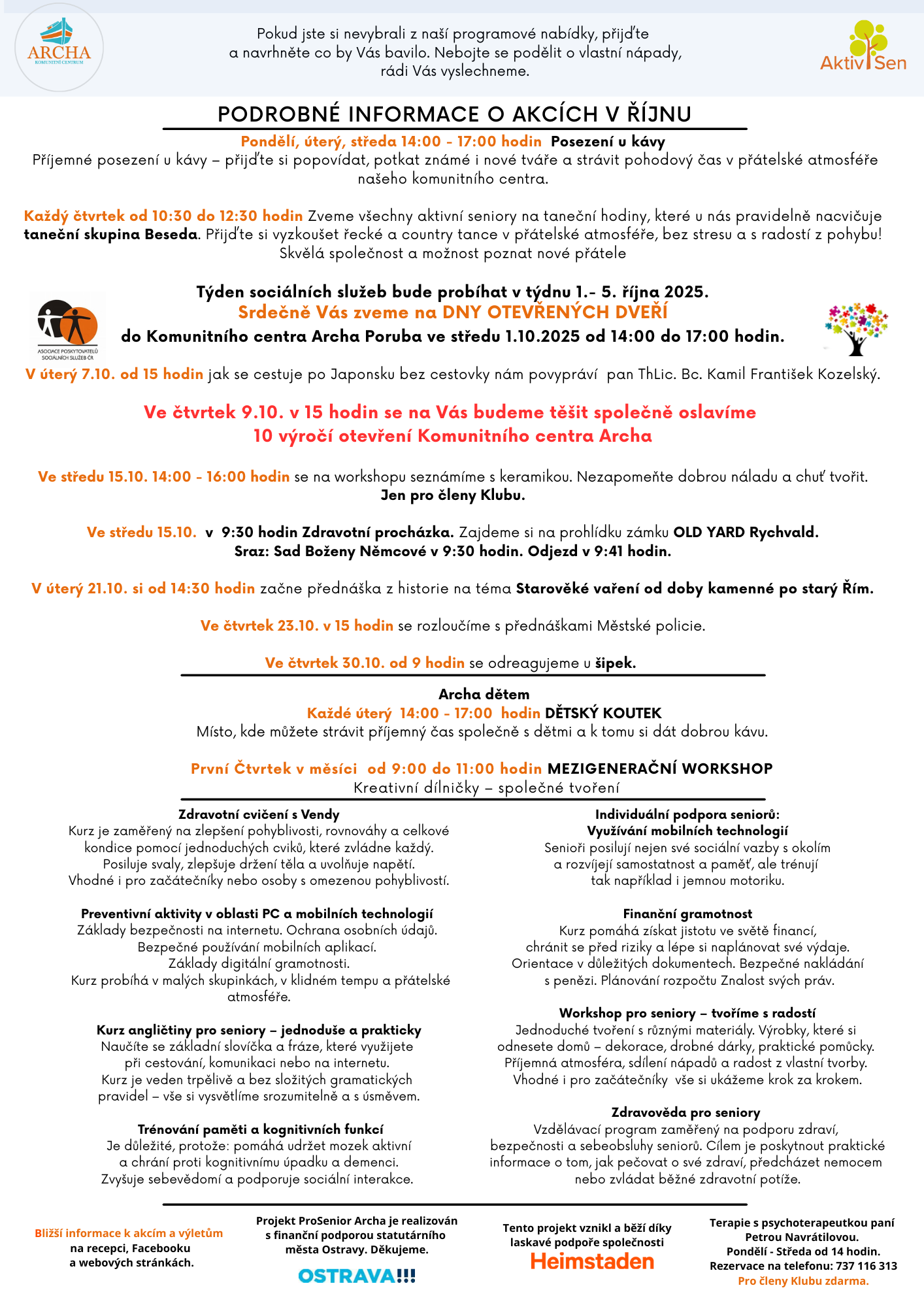 Komunitní centrum Archa slouží seniorům z Poruby, kteří nechtějí být jen doma, chtějí se učit novým věcem a setkávat se s přáteli. Podmínkou pro vstup do centra a využívání jeho prostor je členství v tzv. "Klubu přátel Archa". Tímto opatřením docílíme, že do centra budou docházet lidé, o nichž budeme mít přehled a zamezíme riziku krádeží. Členem se stáváte tehdy, když vypíšete jednoduchou přihlášku, která je ke stažení na našem webu v sekci přihláška, nebo ji obdržíte na recepci. Členové platí roční poplatek 100 Kč, ze kterého se následně platí např. sanitární prostředky.