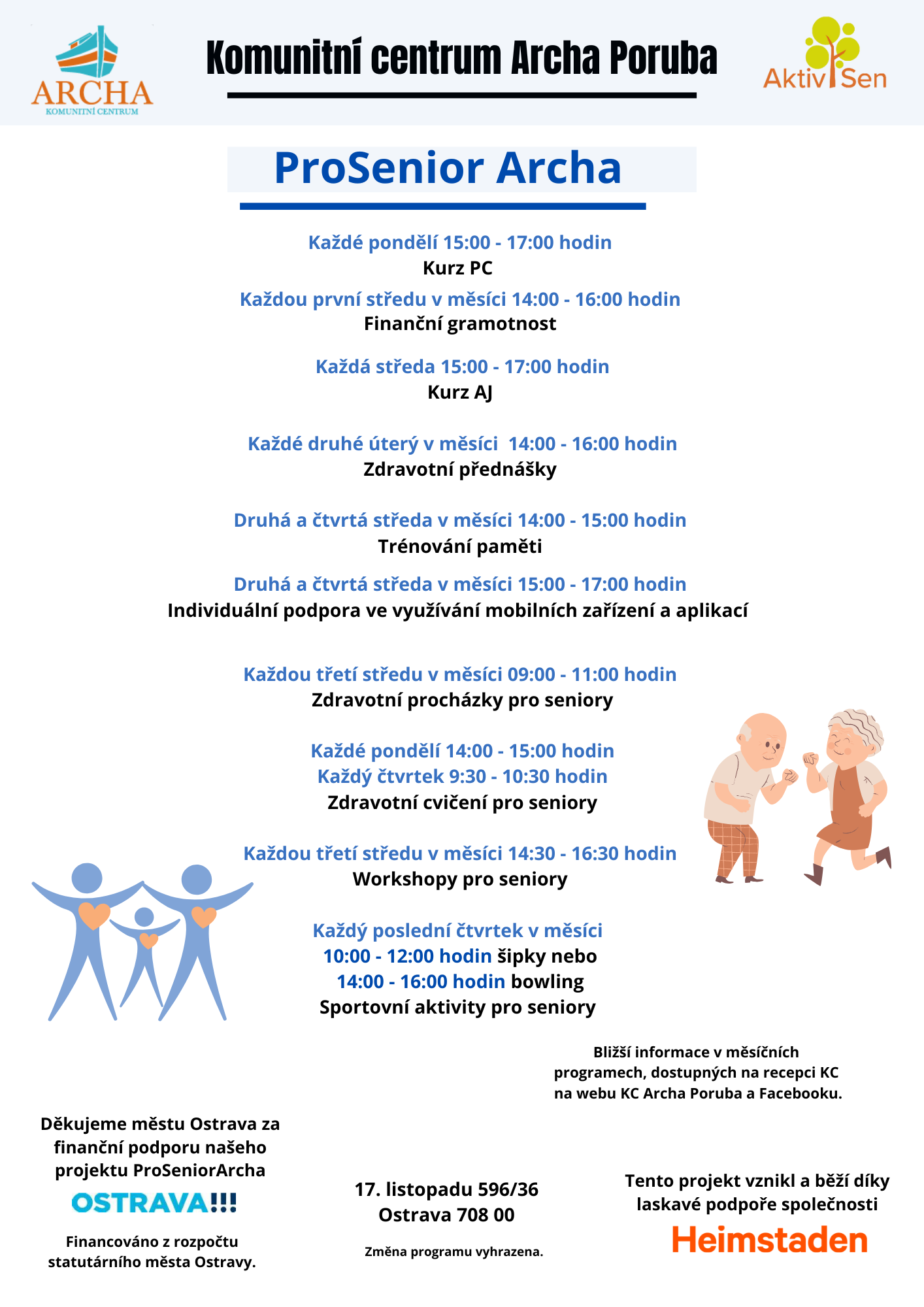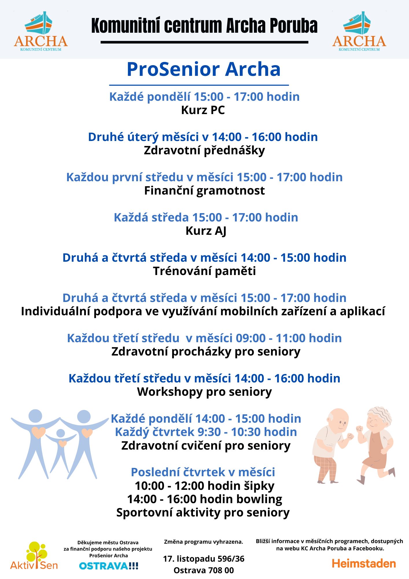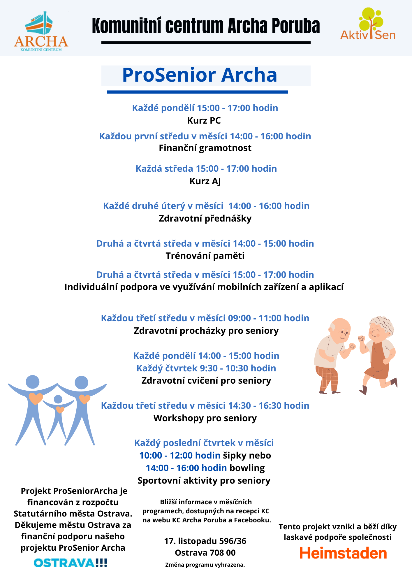 Komunitní centrum Archa slouží seniorům z Poruby, kteří nechtějí být jen doma, chtějí se učit novým věcem a setkávat se s přáteli. Podmínkou pro vstup do centra a využívání jeho prostor je členství v tzv. "Klubu přátel Archa". Tímto opatřením docílíme, že do centra budou docházet lidé, o nichž budeme mít přehled a zamezíme riziku krádeží. Členem se stáváte tehdy, když vypíšete jednoduchou přihlášku, která je ke stažení na našem webu v sekci přihláška, nebo ji obdržíte na recepci. Členové platí roční poplatek 100 Kč, ze kterého se následně platí např. sanitární prostředky.