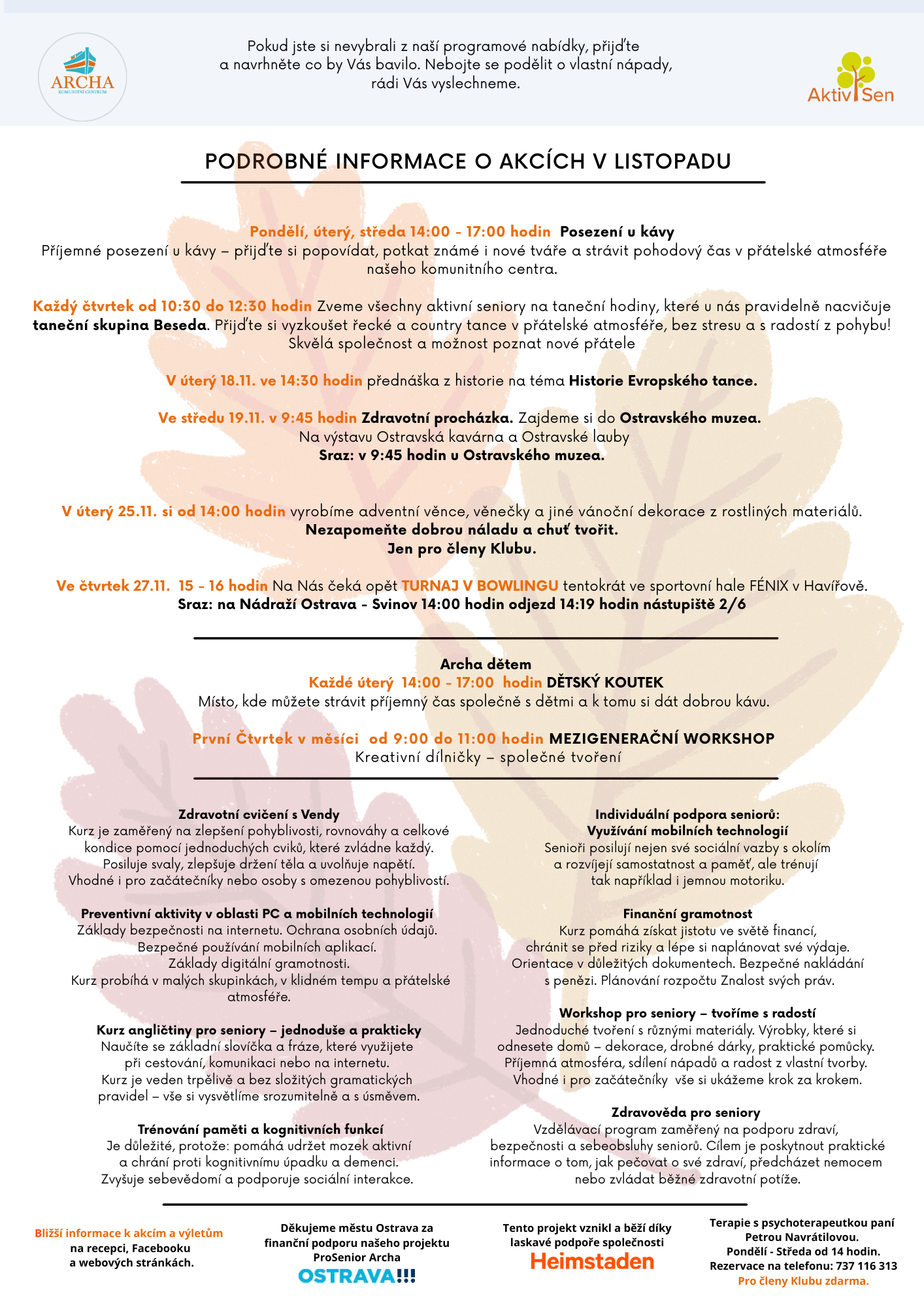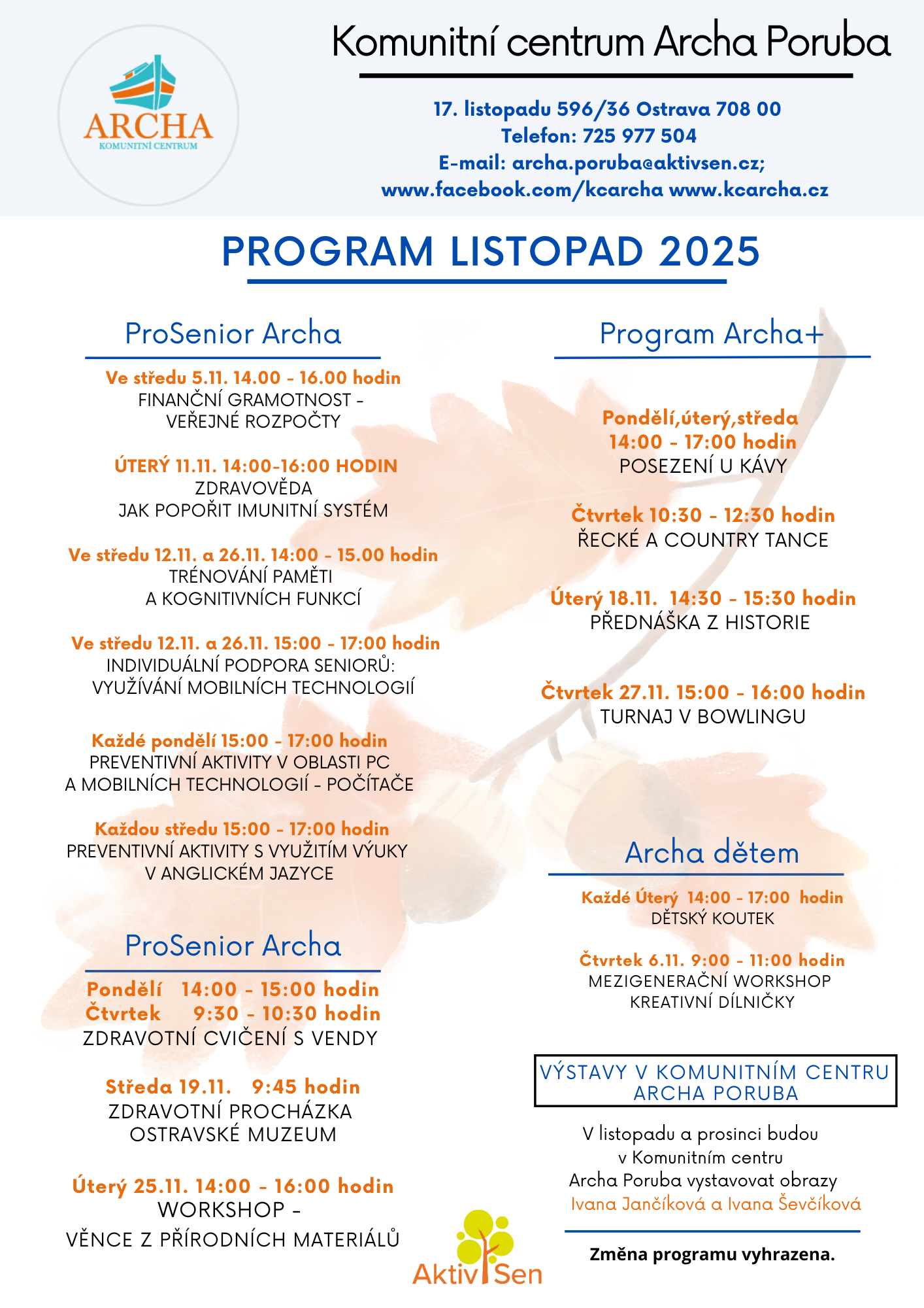 Komunitní centrum Archa slouží seniorům z Poruby, kteří nechtějí být jen doma, chtějí se učit novým věcem a setkávat se s přáteli. Podmínkou pro vstup do centra a využívání jeho prostor je členství v tzv. "Klubu přátel Archa". Tímto opatřením docílíme, že do centra budou docházet lidé, o nichž budeme mít přehled a zamezíme riziku krádeží. Členem se stáváte tehdy, když vypíšete jednoduchou přihlášku, která je ke stažení na našem webu v sekci přihláška, nebo ji obdržíte na recepci. Členové platí roční poplatek 100 Kč, ze kterého se následně platí např. sanitární prostředky.