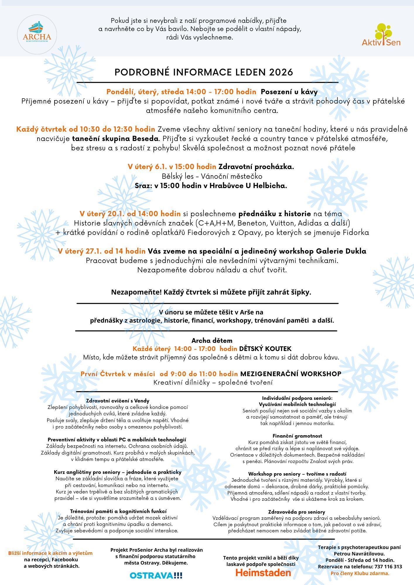 Komunitní centrum Archa slouží seniorům z Poruby, kteří nechtějí být jen doma, chtějí se učit novým věcem a setkávat se s přáteli. Podmínkou pro vstup do centra a využívání jeho prostor je členství v tzv. "Klubu přátel Archa". Tímto opatřením docílíme, že do centra budou docházet lidé, o nichž budeme mít přehled a zamezíme riziku krádeží. Členem se stáváte tehdy, když vypíšete jednoduchou přihlášku, která je ke stažení na našem webu v sekci přihláška, nebo ji obdržíte na recepci. Členové platí roční poplatek 100 Kč, ze kterého se následně platí např. sanitární prostředky.