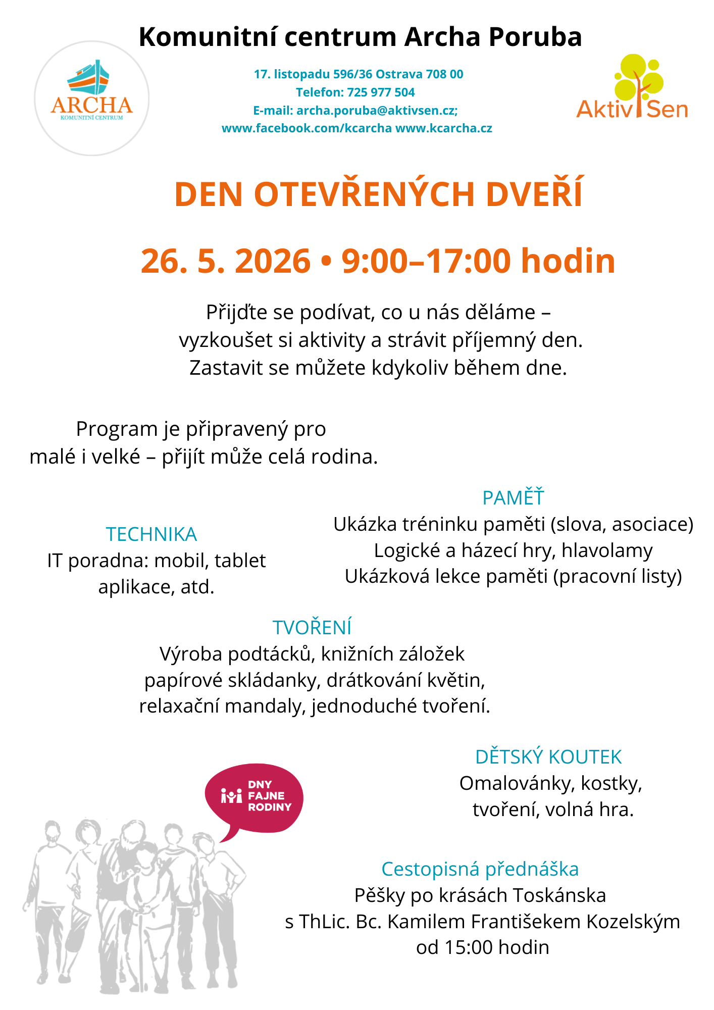 Komunitní centrum Archa slouží seniorům z Poruby, kteří nechtějí být jen doma, chtějí se učit novým věcem a setkávat se s přáteli. Podmínkou pro vstup do centra a využívání jeho prostor je členství v tzv. "Klubu přátel Archa". Tímto opatřením docílíme, že do centra budou docházet lidé, o nichž budeme mít přehled a zamezíme riziku krádeží. Členem se stáváte tehdy, když vypíšete jednoduchou přihlášku, která je ke stažení na našem webu v sekci přihláška, nebo ji obdržíte na recepci. Členové platí roční poplatek 100 Kč, ze kterého se následně platí např. sanitární prostředky.